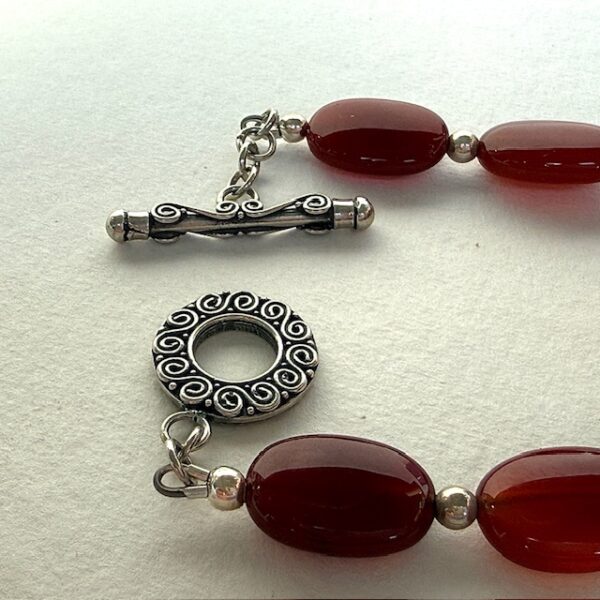 Des perles plates de forme ovale en agate rouge séparées par des perles en argent s’accompagnent d’un beau fermoir en argent de Bali de style toogle donc facile à manipuler.