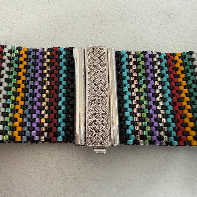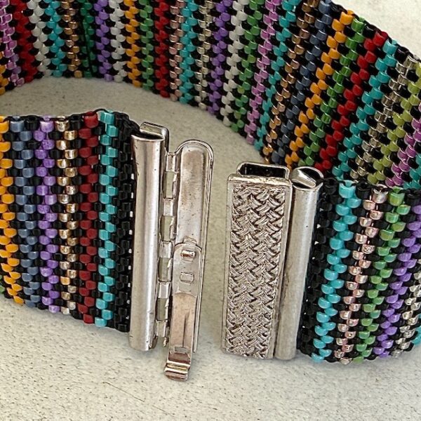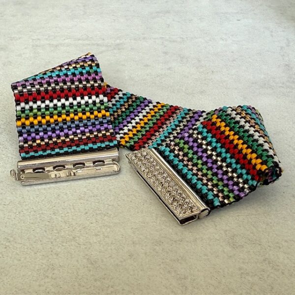 Bracelet type « manchette » composé de perles délicates de verre Miyuki, dans un méli-mélo de couleurs dynamisantes qui pourront s’harmoniser avec tout vêtement.