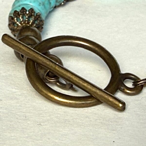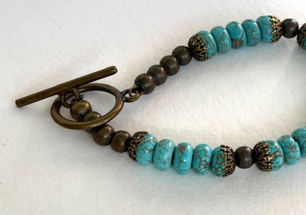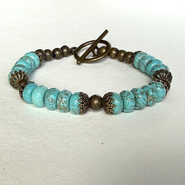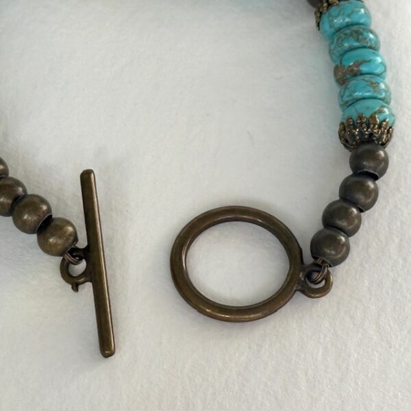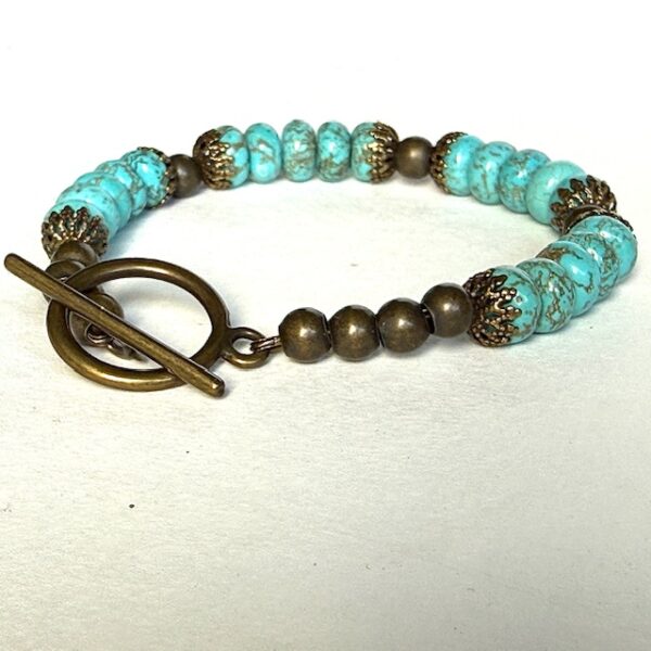 Bracelet de perles aplaties en turquinite agrémentées de coupelles et de perles en métal de couleur bronze, avec un fermoir Toogle.