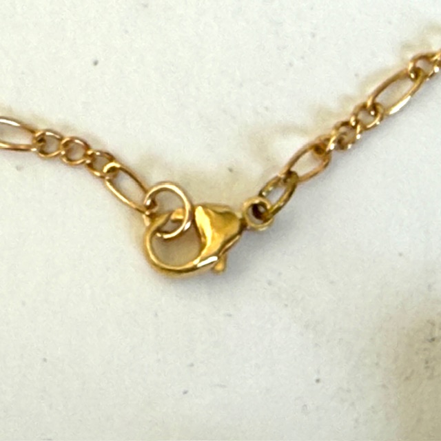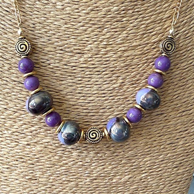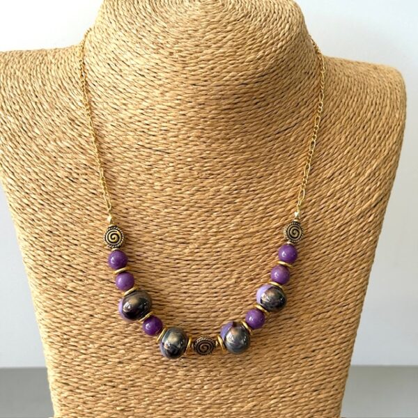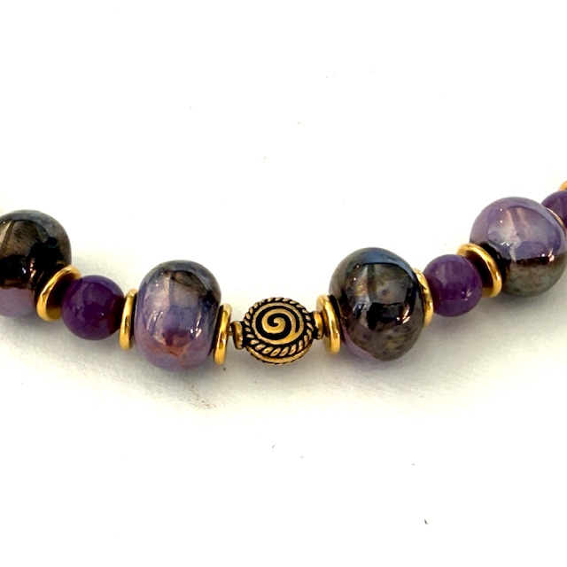 Collier de perles irisées en verre tchèque et en céramique, agrémentées d’éléments décoratifs un métal doré. Sur fil cablé, fermé par un mousqueton classique en gold filled.