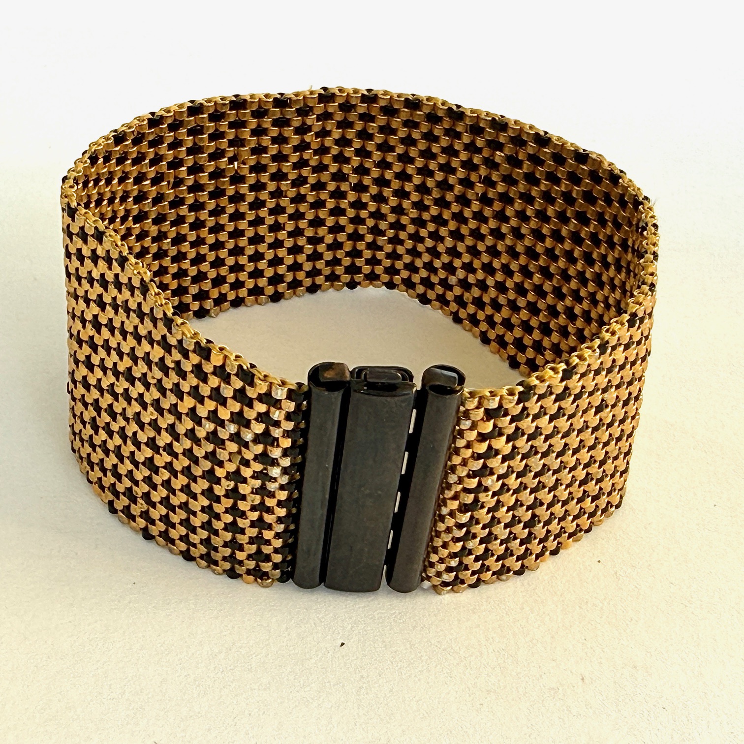 En noir et doré les petites perles Miyuki tissées pour une manchette stylée et sobre avec son fermoir noir mat.