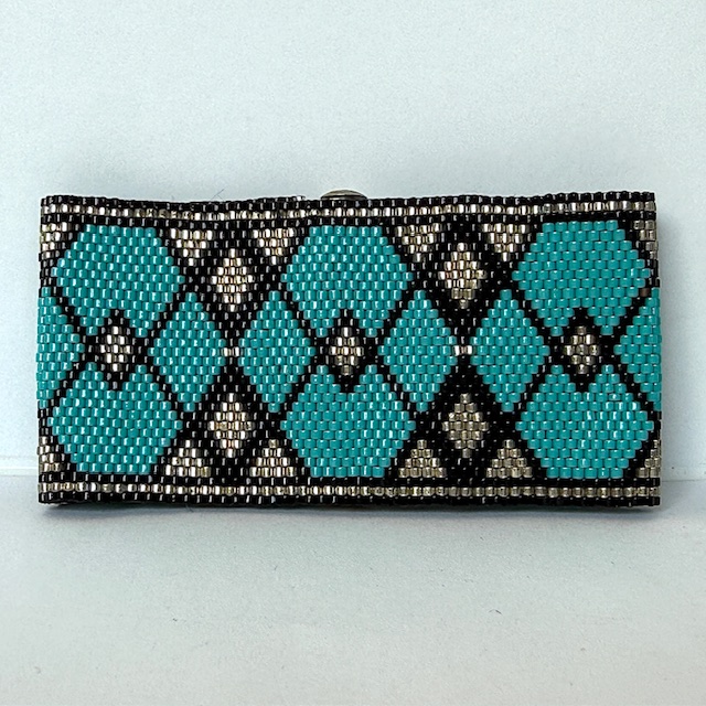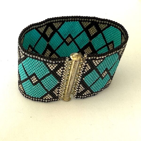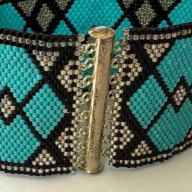 Large manchette alliant noir bleu et argent dans un graphisme mettant en valeur les perles fines Miyuki, avec un fermoir coulissant argenté.