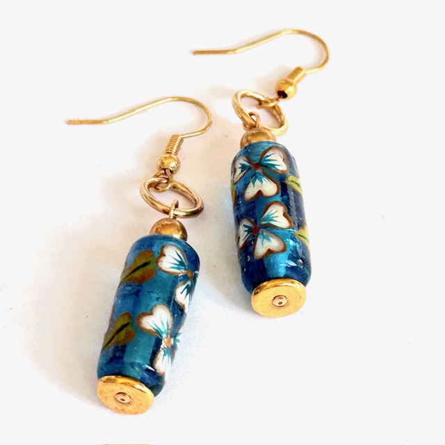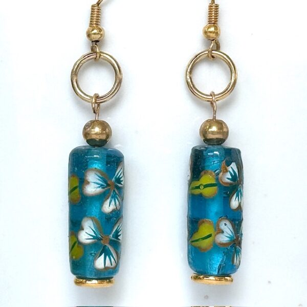 Deux jolies perles artisanales en verre venant de l’Inde dont le décor a été peint à la main en crème et turquoise, de forme tube (20×9 mm).